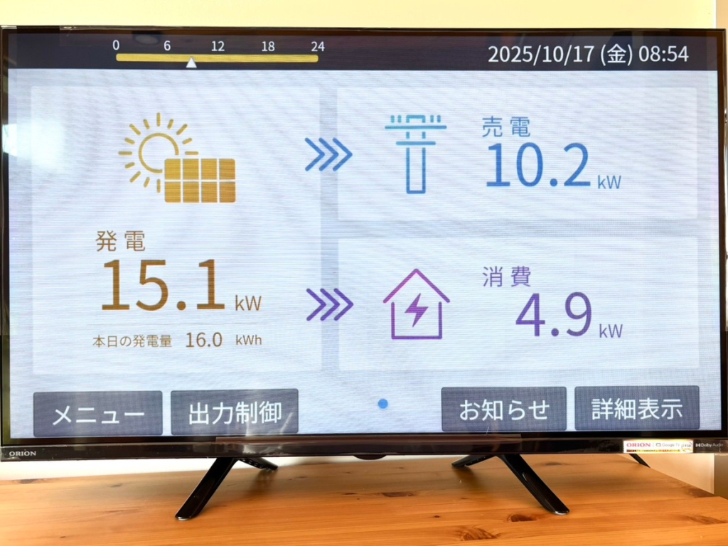 また、本会の玄関には、太陽光でのリアルタイムな発電状況を確認できるモニターを設置しました。エネルギーの「見える化」を通じて、ご来会の皆様に当会の取り組みを知っていただければ幸いです。
