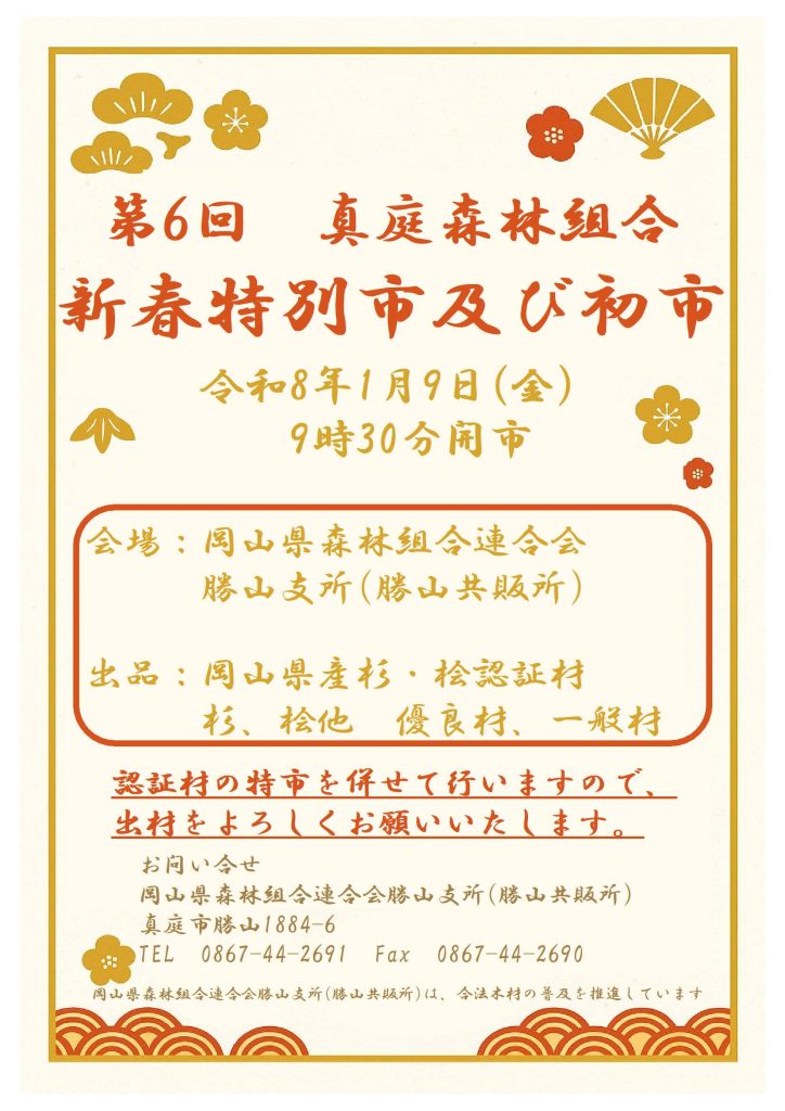 2025.12.22 勝山支所 特別市のご案内 令和8年1月9日(金)9時30分から「第6回真庭森林組合新春特別市及び初市」を開催いたします。 皆様のご来所、お待ちしております。 次の記事へ お知らせ一覧 次の記事 一覧へ戻る