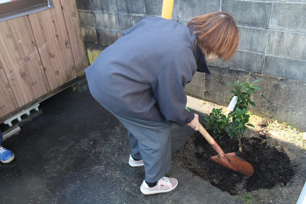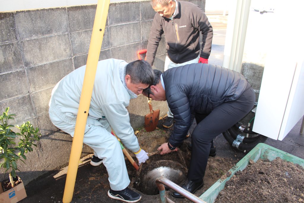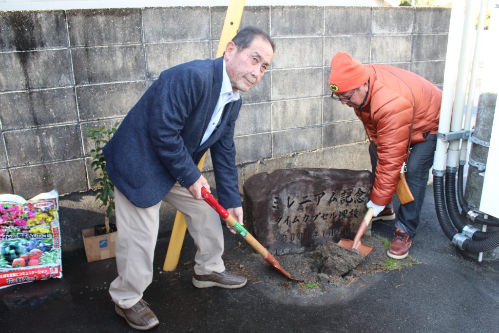 続いて、タイムカプセルの掘り起こしが行われ、掘り起こした場所にはキンカンを記念樹として植栽しました。