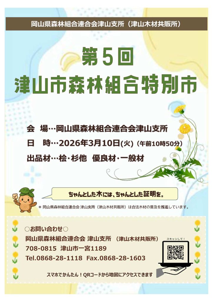2026.02.19 津山支所 特別市のご案内 3月の特別市のご案内です。 2026年3月10日(火)10:50より「第5回津山森林組合特別市」を開催いたします。皆様のご来所をお待ちしております。 次の記事へ お知らせ一覧 次の記事 一覧へ戻る