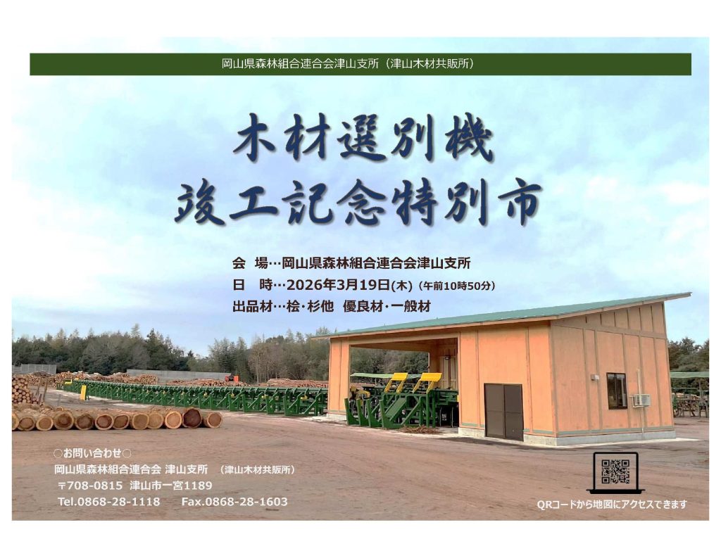 2026.03.11 津山支所 特別市のご案内 3月の特別市のご案内です。 2026年3月19日(木)10:50より「木材選別機 竣工記念特別市」を開催いたします。皆様のご来所をお待ちしております。 次の記事へ お知らせ一覧 前の記事へ 次の記事 前の記事 一覧へ戻る