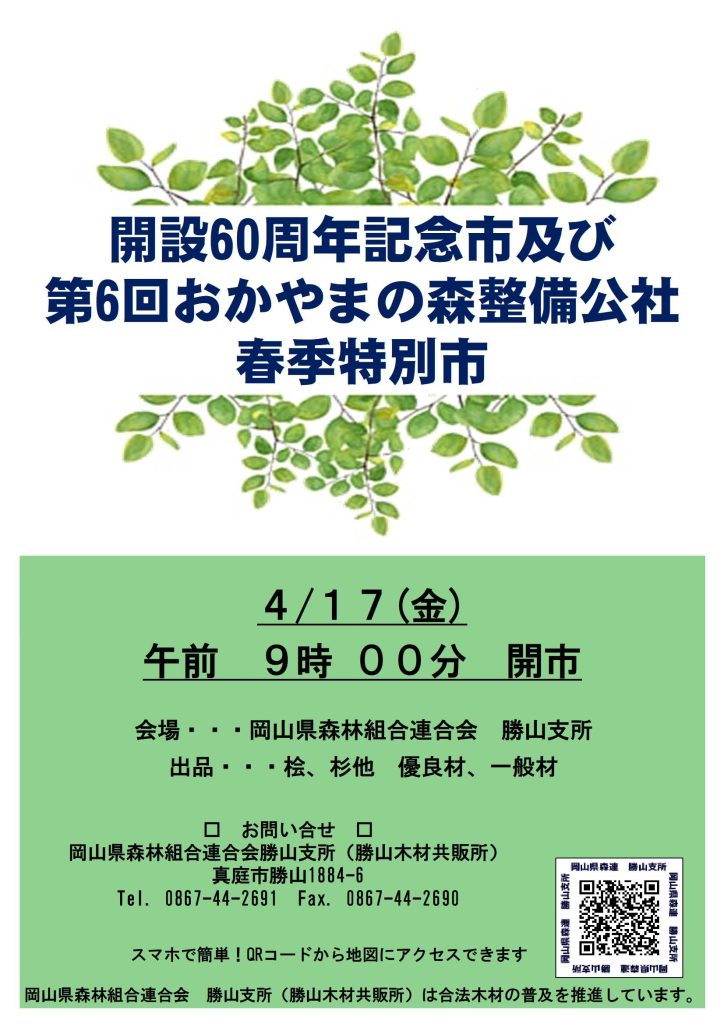 2026.03.23 勝山支所 特別市のご案内 令和8年4月17日(金)午前9時00分から「開設60周年記念市及び第6回おかやまの森整備公社春季特別市」を開催いたします。 皆様のご来所、お待ちしております。 次の記事へ お知らせ一覧 前の記事へ 次の記事 前の記事 一覧へ戻る