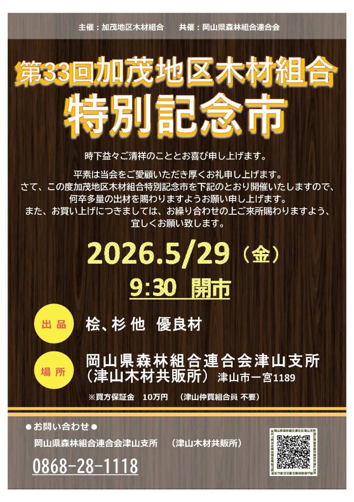 2026年5月29日(金)9:30より「第33回加茂地区木材組合特別記念市」を開催いたします。皆様のご来所をお待ちしております。